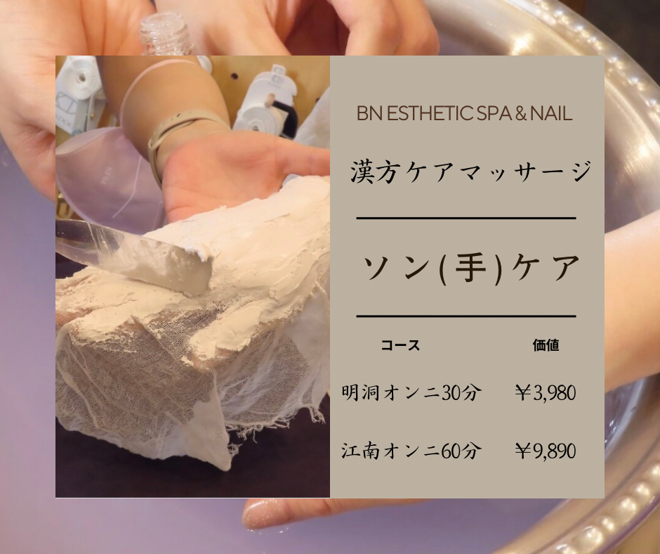 BN ESTHETIC SPA & NAILでは、手の美しさと健康を追求するための**「ソン(手)ケア」漢方ケアマッサージを提供しています